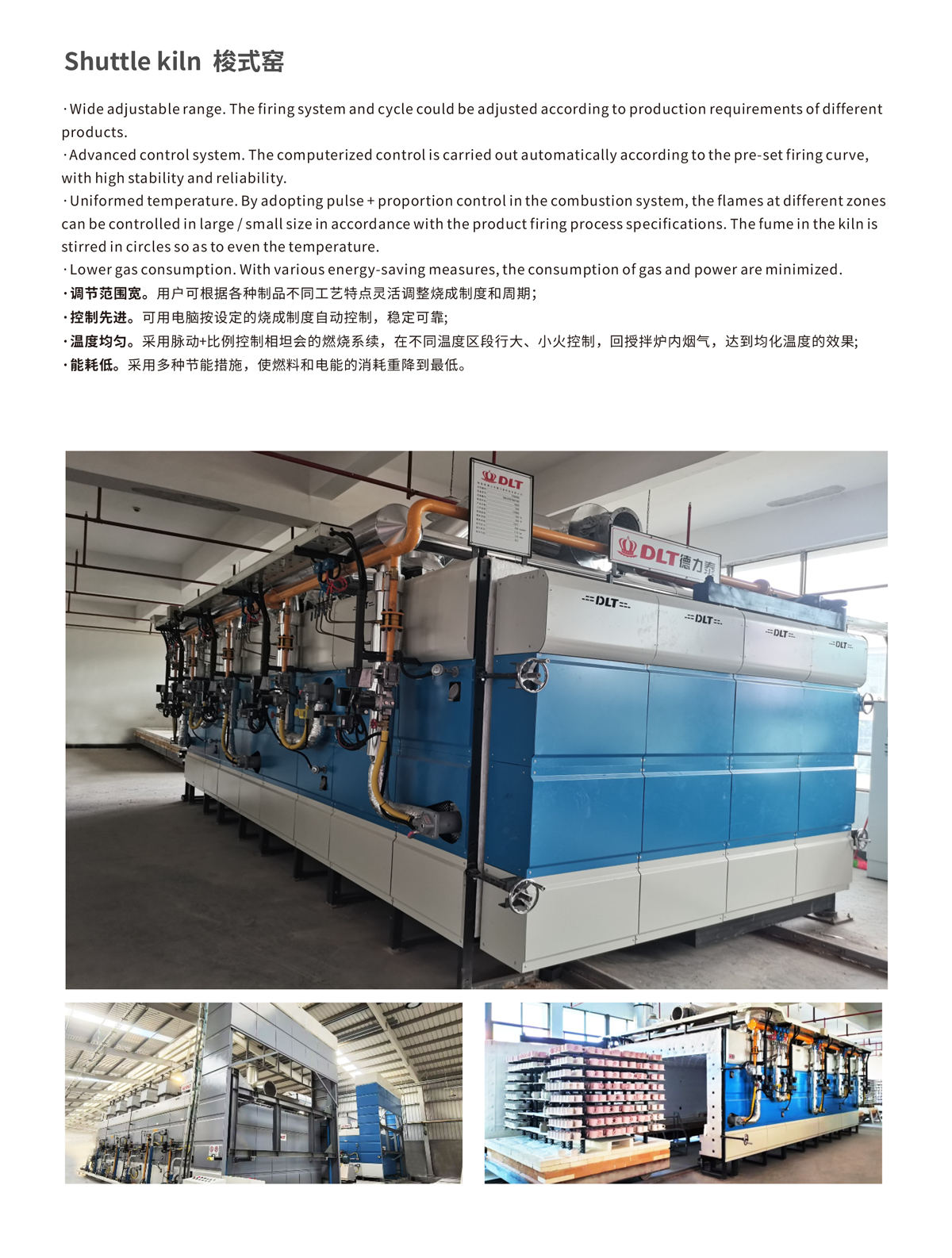 Uniformed temperature. By adopting pulse + proportion control in the combustion system, the flames at different zones can be controlled in large / small size in accordance with the product firing process specifications. The fume in the kiln is stirred in circles so as to even the temperature.