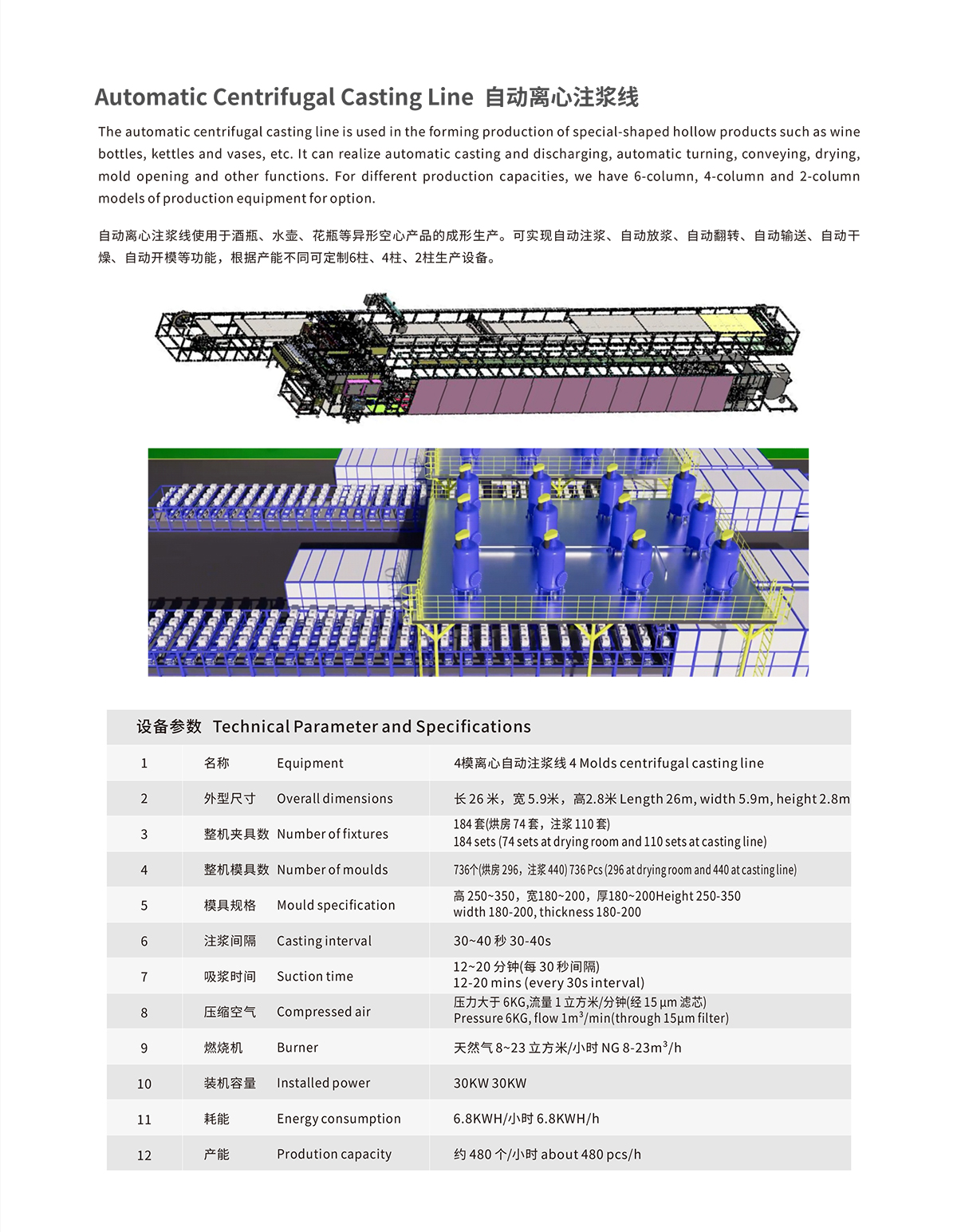 自动离心注浆线使用于酒瓶、水壶、花瓶等异形空心产品的成形生产。